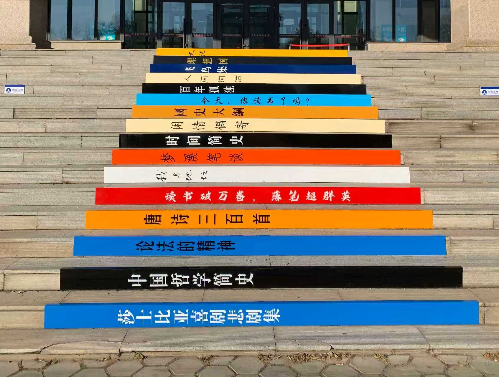亲爱的同学们,你是否曾留意过图书馆正门前那十六级台阶?它们迎来了一次华丽的变身——化身成为承载智慧与经典的“书梯”!这座融合了实用性与文化内涵的“书梯”以其独特的设计和丰富的文化含量,成为图书馆一道亮丽的文化风景线。