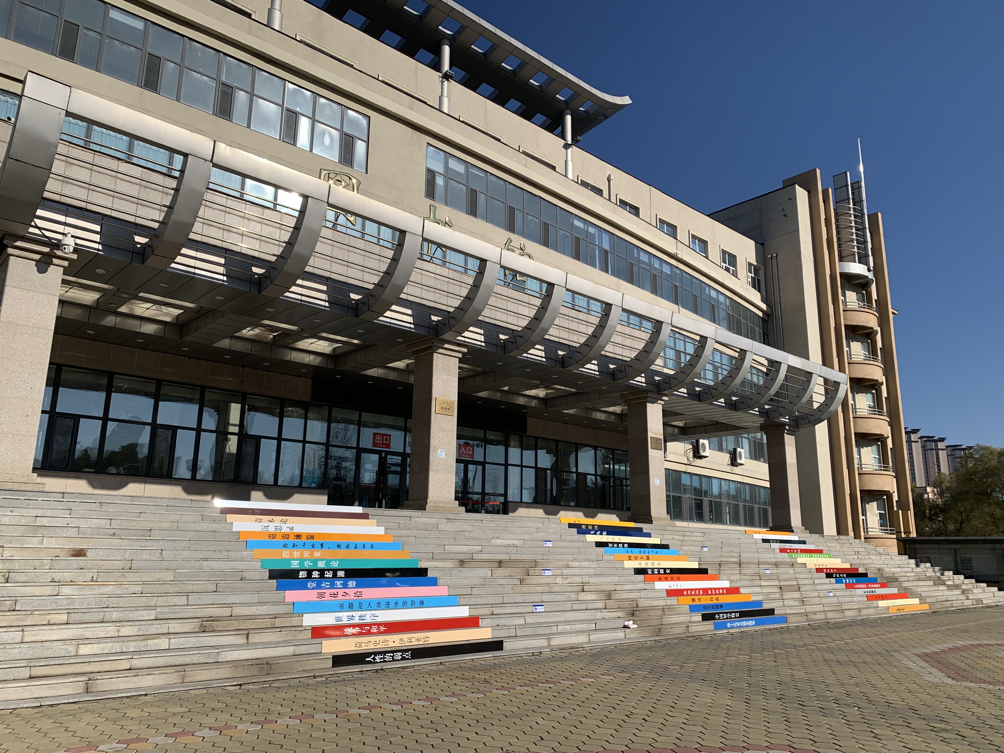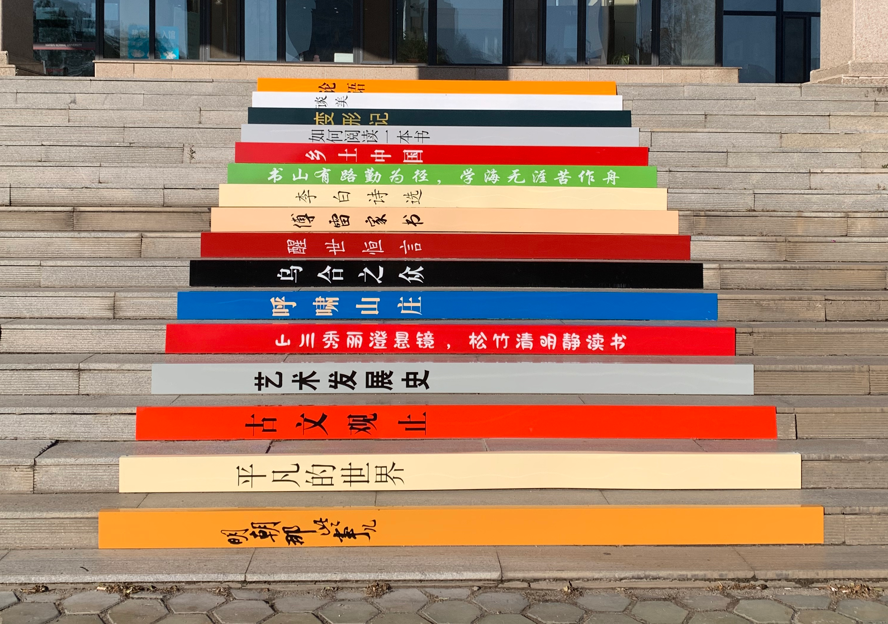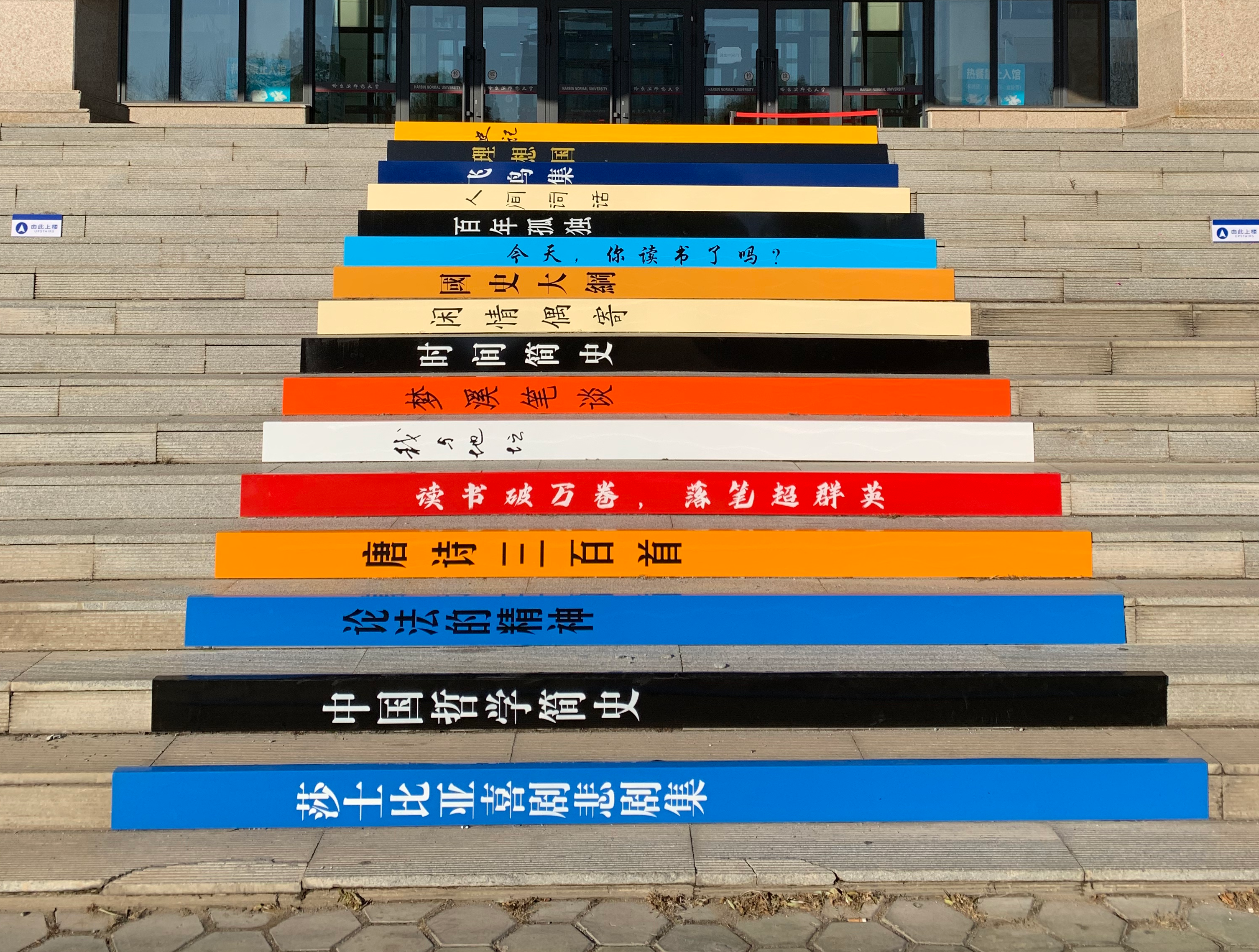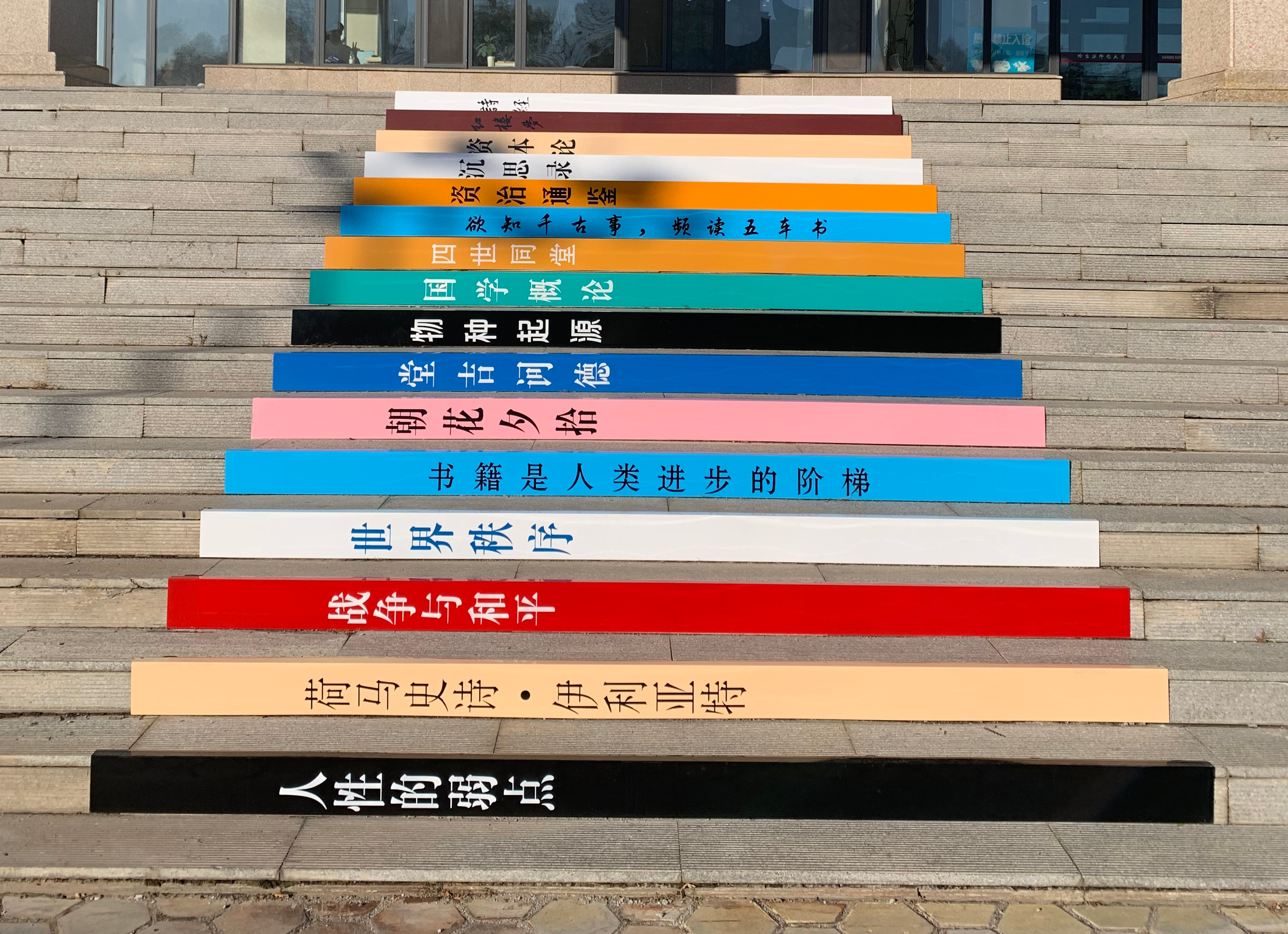 亲爱的同学们,你是否曾留意过图书馆正门前那十六级台阶?它们迎来了一次华丽的变身——化身成为承载智慧与经典的“书梯”!这座融合了实用性与文化内涵的“书梯”以其独特的设计和丰富的文化含量,成为图书馆一道亮丽的文化风景线。