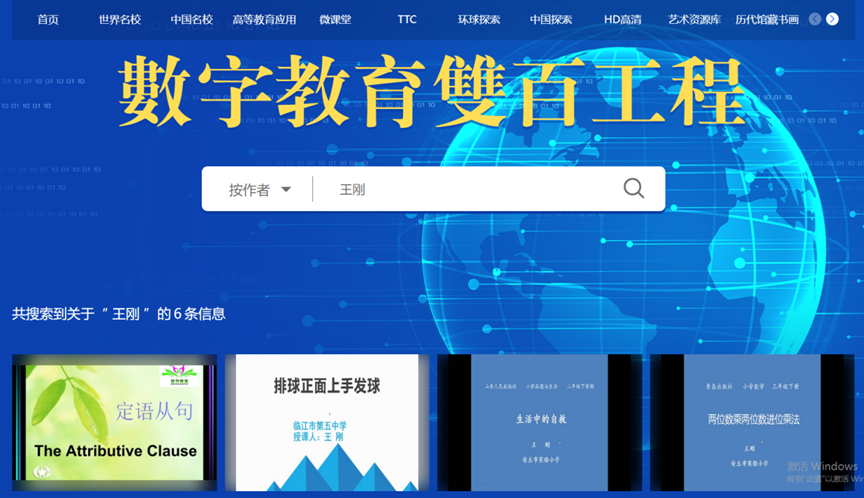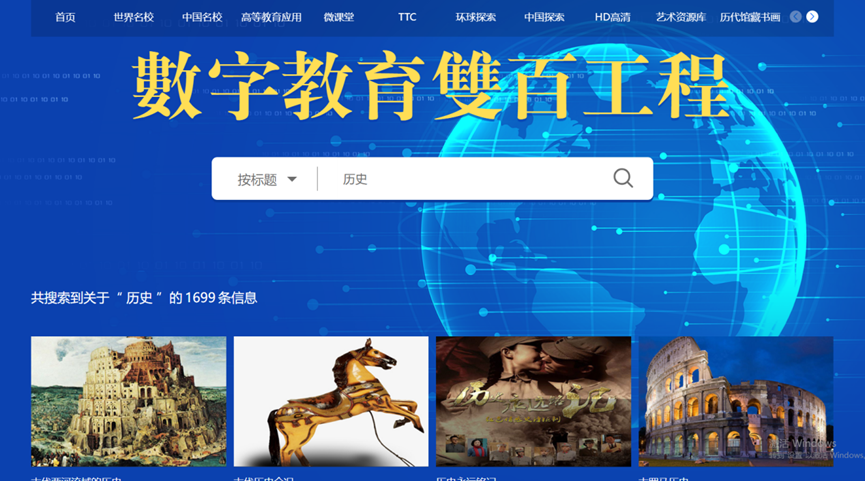 1、点击数字教育双百工程网址,进入平台首页,在页面的中间可以看到关键字搜索栏,在这里可以按照标题、作者、简介三种方式进行搜索,举例:按标题搜索“历史”,就会出现所有跟历史标题相关的视频,便于我们快速查找到自己需要的视频。