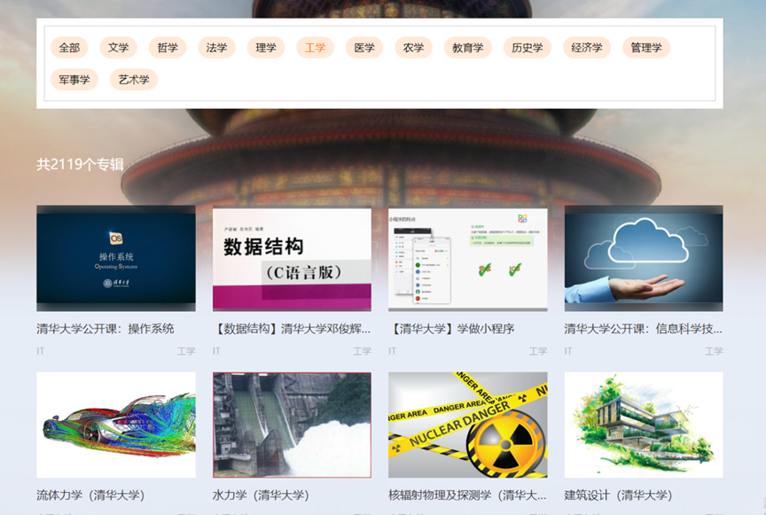 2、点击数字教育双百工程网址,进入平台首页,下拉选择大类页面,根据需求阅读学习。例如:点击中国名校精品课程,进入可观看此系列所有视频,为了方便查找,中国名校系列视频细分为文学、哲学、法学、理学、工学、医学、农学、教育学、历史学、经济学、管理学、军事学、艺术学。点击“工学”,就可以进入观看需要的视频内容。